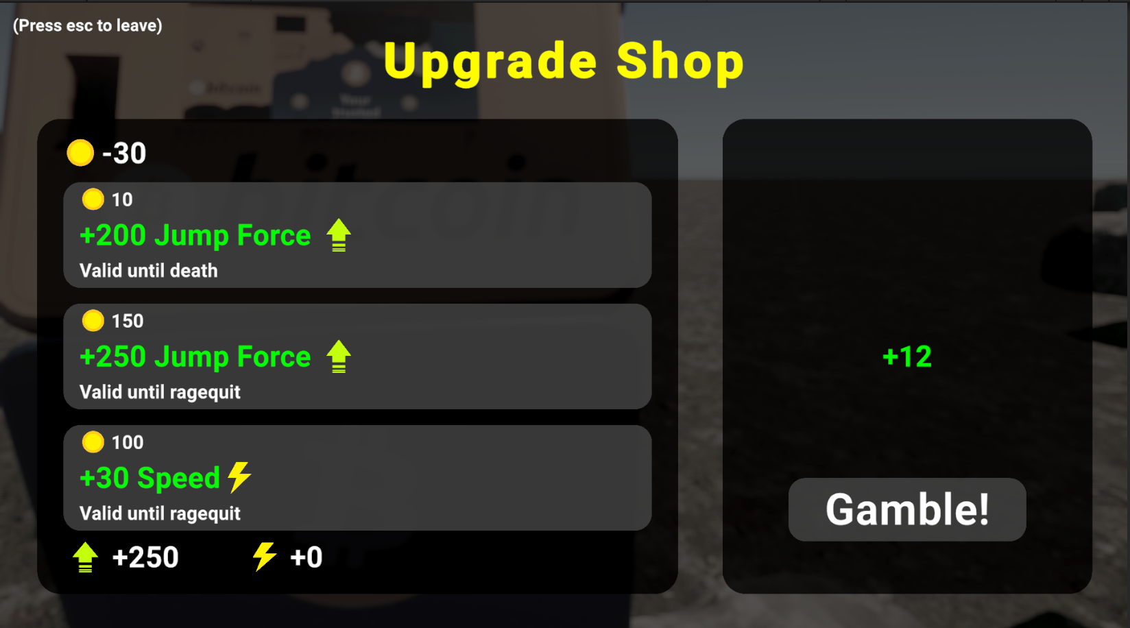 The next problem I had to address was the gambling system. In the BGJ version, you could spam the gamble button until your stats were absolutely insane. I decided to replace this by implementing a currency which you buy upgrades with. This also solved the problem of the game being literally impossible when your stats are below 1.0x